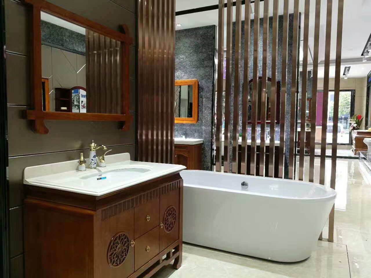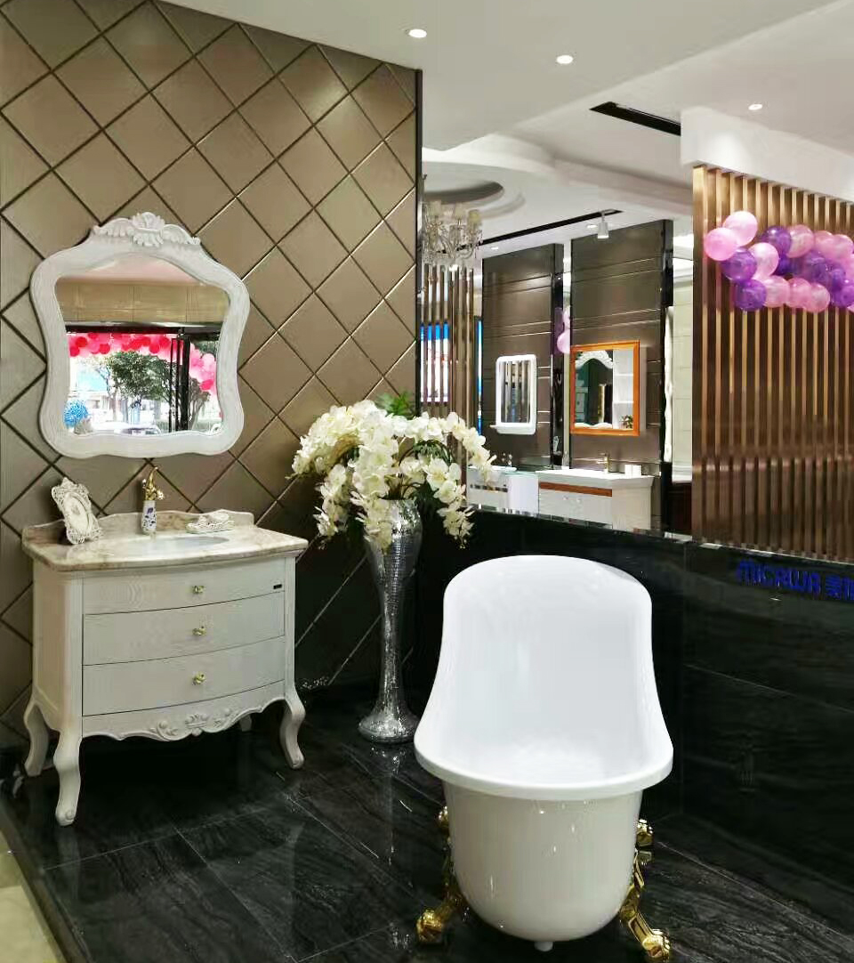 除了坐便器,美加華衛(wèi)浴的另一王牌產(chǎn)品——浴室柜,在店內(nèi)也是隨處可見?;蚴菤W式、美式的華貴、或是中式的典美,又或是現(xiàn)代的簡約,琳瑯滿目的品種,讓消費者在一店便可享受多樣的選購體驗。