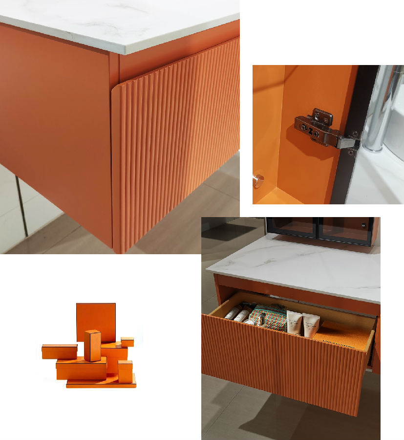 除去方圓融合的造型,色彩也是美加華方圓浴室柜的殺手锏。受國際奢侈品牌愛馬仕啟發(fā),經專業(yè)調色師調配“愛馬仕橙”,色彩飽滿明媚,卻又不會過分艷麗夸張。